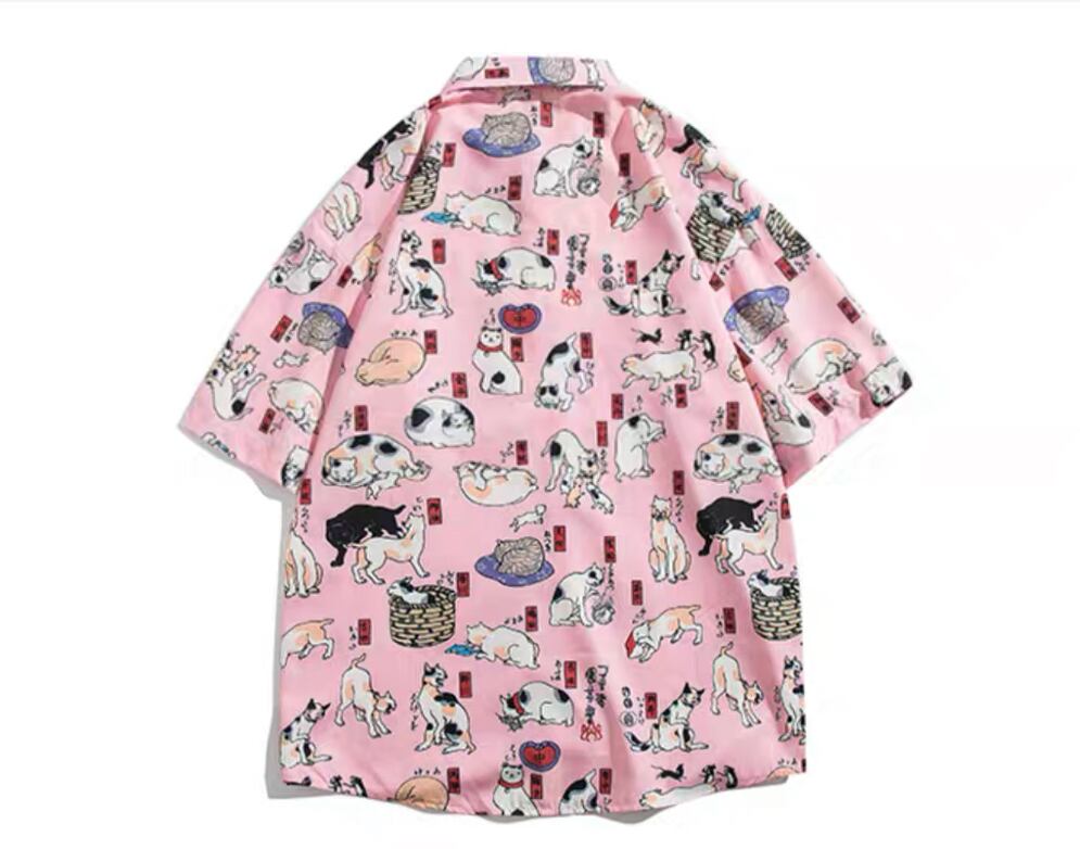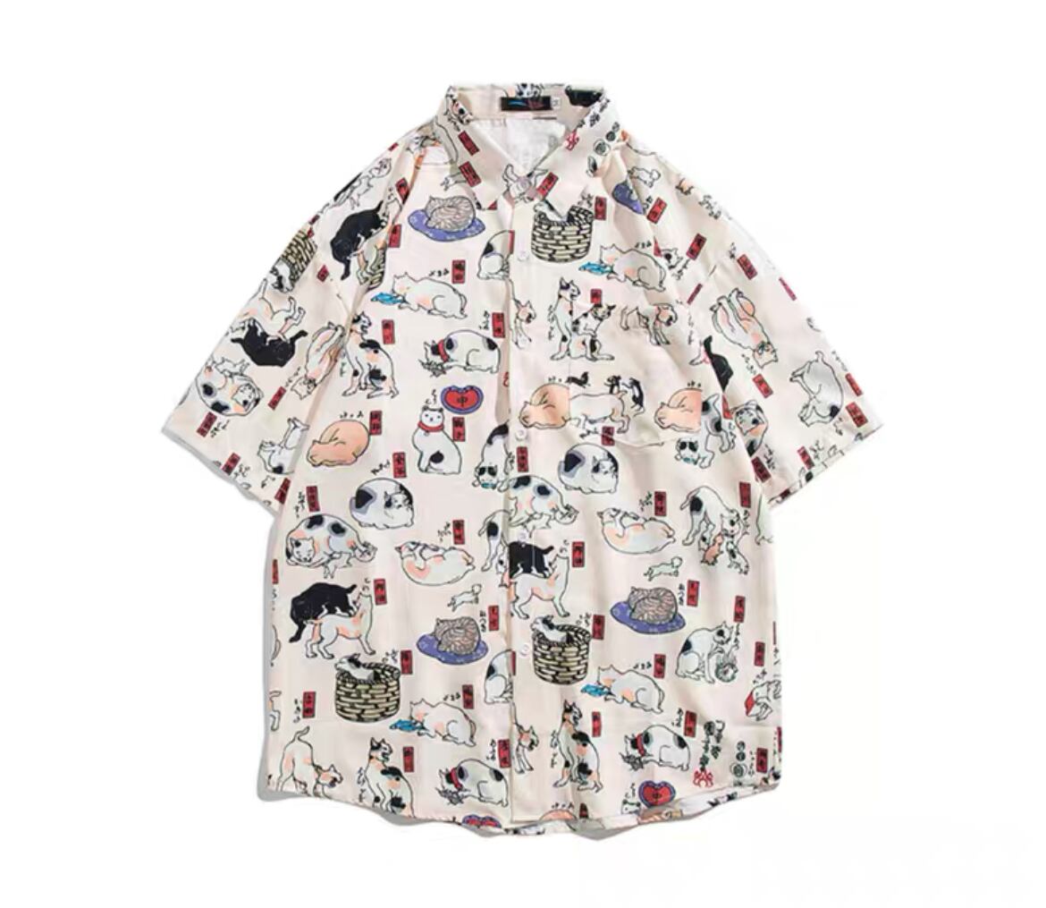ユニークな猫飼好五十三疋(ねこかいすく ごじゅうさんぴき)の柄が特徴のシャツ。猫好きな方々にはたまらないデザインです。柄のイラストは手描き風で、猫たちが様々なポーズで描かれています。シンプルなデザインなので、デイリーコーディネートに取り入れやすく、周りと差をつけたい方におすすめです。